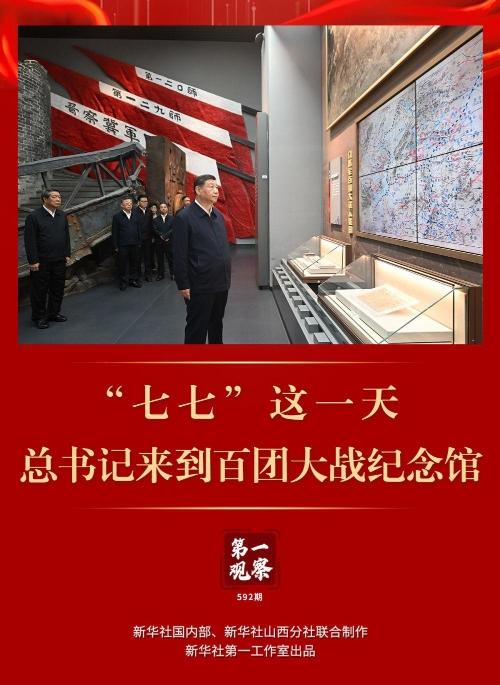 7月7日,是全民族抗战爆发88周年纪念日。当天下午,习近平总书记在山西省阳泉市考察。总书记来到百团大战纪念碑广场,向百团大战烈士敬献花篮,参观百团大战纪念馆,缅怀抗战烈士英雄事迹,重温中国共产党领导抗日军民同仇敌忾、勇御外侮的光辉历史,了解当地开展革命历史教育、传承弘扬伟大抗战精神等情况。