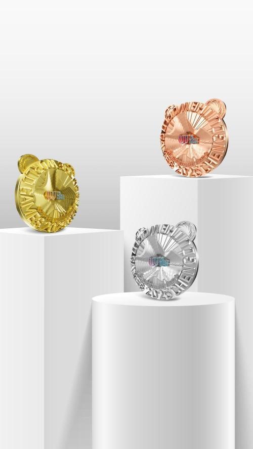 这是成都世运会金、银、铜牌效果图。6月19日,2025年第12届世界运动会奖牌“竹光”正式亮相。新华社发(成都世运会执委会供图)