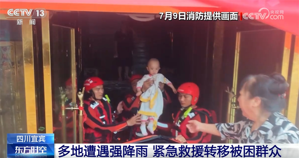 在宜宾珙县上罗镇,街道积水已经有一米多深,部分地方积水已淹没一楼,有不少群众被困,救援人员在齐腰深的积水中采取接力方式转移被困群众。在一楼淹没区域,消防救援人员通过架设爬梯,将被困在二楼的群众转移至橡皮艇,送往安全区域。强降雨还导致珙县曹营镇、罗渡苗族乡等地出现大范围停电,部分道路因积水无法通行,通信出现异常。