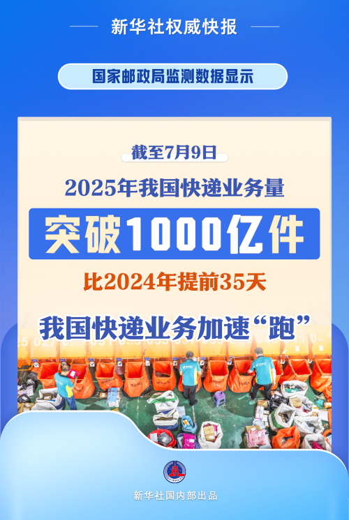 国家邮政局监测数据显示,截至7月9日,今年我国快递业务量突破1000亿件,比2024年提前35天。