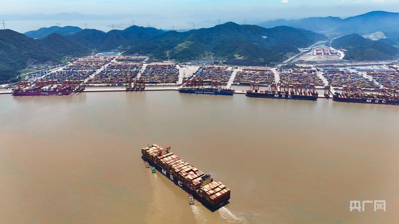 满载货物的“地中海洛雷托”号正缓缓靠泊宁波舟山港(央广网记者 尚天宇 摄)