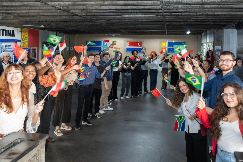 6月27日,巴西里约热内卢州立大学的学生欢迎文明对话系列活动参会嘉宾到来。新华社记者王天聪摄