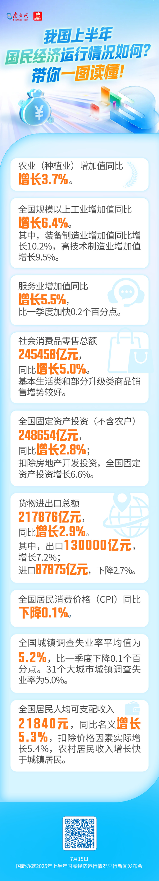 7月15日,国新办就2025年上半年国民经济运行情况举行新闻发布会。据介绍,上半年,国民经济迎难而上、稳中向好。初步核算,上半年国内生产总值660536亿元,按不变价格计算,同比增长5.3%。