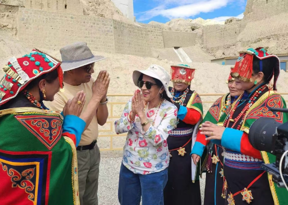△尼泊尔驻拉萨总领事拉克希米·普拉萨德·尼罗拉及夫人在阿里地区古格王朝遗址同宣舞演员互动