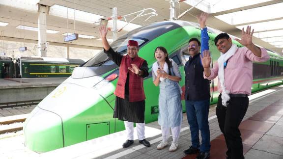 △印度印地新闻台拍摄团队与总台亚非中心记者在拉日铁路复兴号动车组列车旁合影