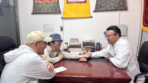 △蒙古国MGL电台总编、主持人孟赫巴特(中)体验藏医把脉问诊