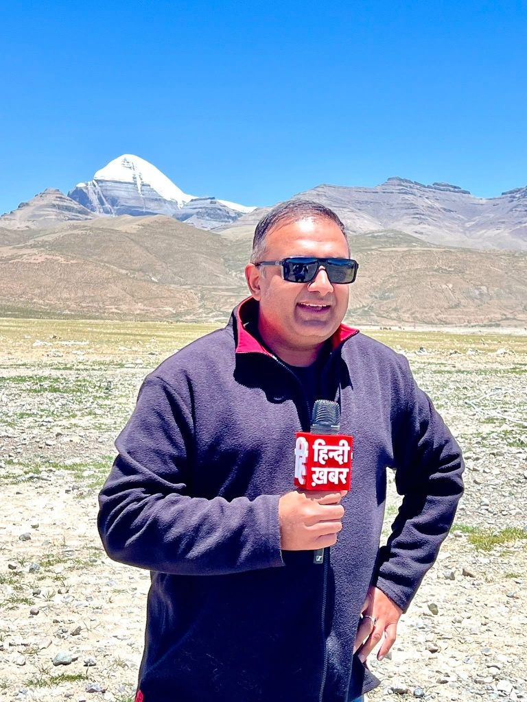 △印度印地新闻台总经理兼总编辑阿图尔·阿格拉瓦尔在阿里地区冈仁波齐雪峰前录制节目