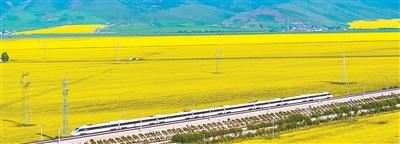 青海门源回族自治县,一列高铁动车驶过美丽的油菜花海。杨潇 摄(人民视觉)