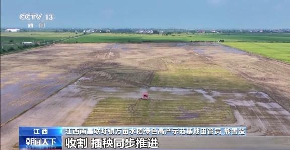 江西南昌新建区联圩镇万亩水稻绿色高产示范基地田管员熊雪楚:我们基地6000多亩的早稻和晚稻,收割、插秧同步推进,上百台机械同时作业,用两个星期就可以全部搞完,效率比人工高多了。