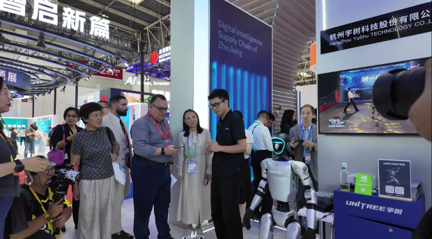 “创新味”还体现在机器人的身影多了。在英伟达展台、湖北人形机器人展区,以及参与浙江“数智潮涌 龙跃浙里”主题专区的宇树科技和强脑科技展台,灵巧手、机器狗、工业机器人、人形机器人等产品吸引着不少中外观众上前互动体验。