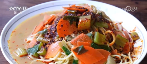 在煮过面的原汤里放入切好的芹菜、胡萝卜,不用添加任何佐料,等菜煮熟,这浇头就做好了。上桌前,将原汁原味的浇头浇在面条上,再调入红艳的油泼辣子、浓稠的芝麻酱、辛香的蒜水,以及香醋等特制调料,就是兰州人夏日里最爱的素凉面。