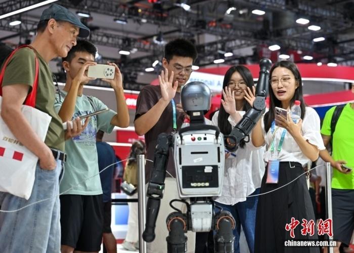 资料图:7月19日,北京,参观者与展出的人形机器人挥手互动。当日,第三届中国国际供应链促进博览会迎来公众开放日。记者 赵文宇 摄