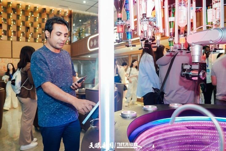 巴基斯坦青年学者阿里夫·贾维德记录下“中国酒都”现代化的另一面。扫码支付后,玻璃舱内的机械臂马上开始操作:加冰、加酒、摇晃、倒出,不一会儿,一杯AI特调酒就到了他的手中。