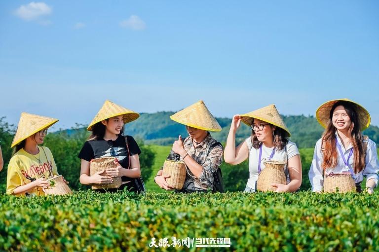 交流团正在湄潭万亩茶海体验采茶