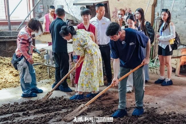 交流团在传统烧酒坊里体验古法酿造中的“下沙”环节