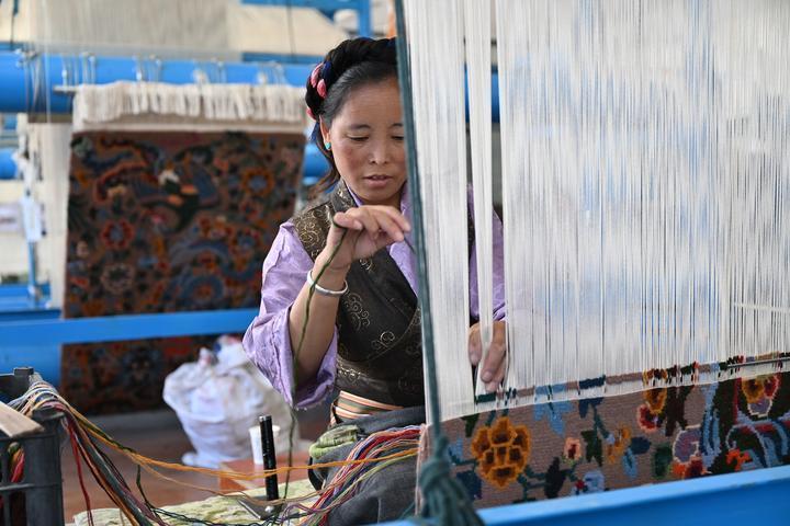 在日喀则市江孜县的一家藏毯编织车间里,珍拉正盘腿坐在织架前,双手在密集的经线间灵巧地穿梭、挑动、打结,一幅寓意吉祥的大鹏金翅鸟图案,在她手下逐渐成形。