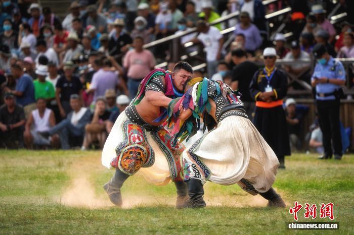 2024年8月,内蒙古呼伦贝尔,新巴尔虎右旗那达慕大会上的搏克手在赛场上激烈角逐。 田昊霖 摄
