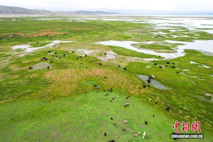 7月22日,在西藏阿里地区普兰县霍尔乡,牧民在玛旁雍错湿地上放牧牦牛。为实现更大的经济效益,霍尔乡近年来探索建立牦牛养殖专业合作社,按当地自然条件合理分配牦牛放牧地点,并将牛奶进行加工销售,2023年该合作社的年总收入达到60余万元人民币,带动牧民人均增收2万余元人民币。(无人机照片)中新社记者 张祥毅 摄