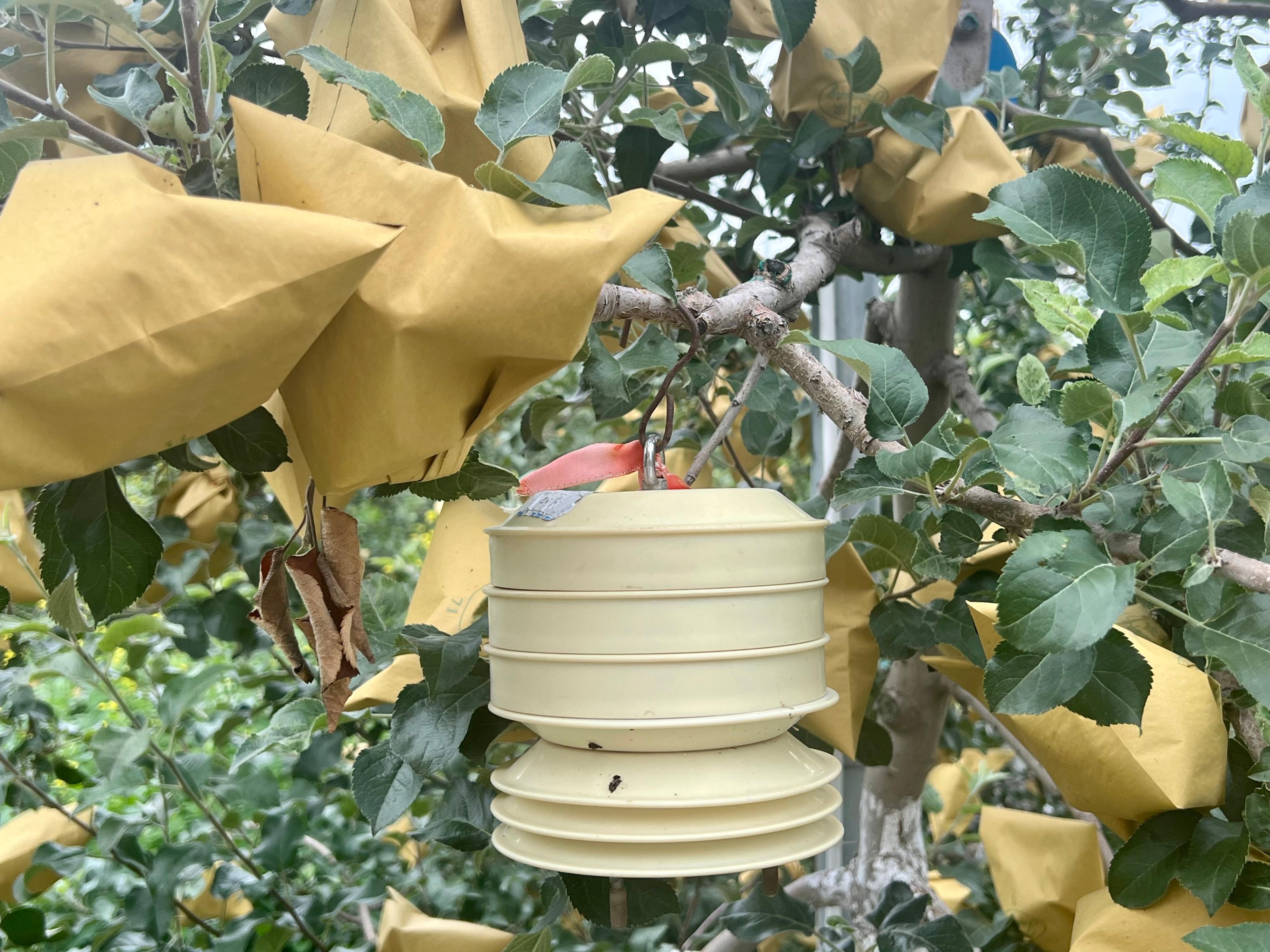 谈到成功防灾的秘诀,志丹县农业农村局二级主任科员张宏拨开果树枝叶,指着枝头挂着的一件仪器说:“全靠这个‘气象小哨兵’。”