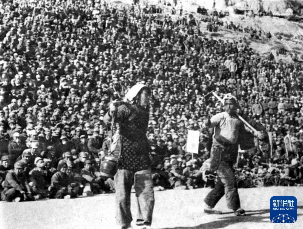 延安鲁迅文艺学院王大化、李波在广场为群众演出秧歌剧《兄妹开荒》。吴印咸 摄