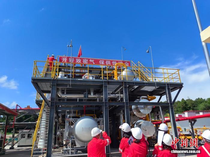 采访团首站来到成都世运会天然气保供的“源头”——位于成都简阳市石钟镇均乐社区的川西北气矿永浅3井集气站。只见整个站场上塔管林立,在骄阳下运行紧张有序,一线员工头顶烈日坚守岗位正在作业,塔台上一排“开好致密气 保供世运会”的大字分外亮眼。