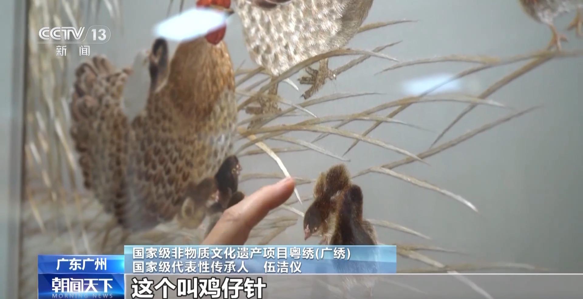国家级非物质文化遗产项目粤绣(广绣)国家级代表性传承人 伍洁仪:这个叫鸡仔针,因为要凸显每个小鸡都很活泼,把毛做得竖起来了,要一种技巧。还有渗针,正面把光亮渗出来。而且每一个荔枝大小不一致,都是有纹路的。