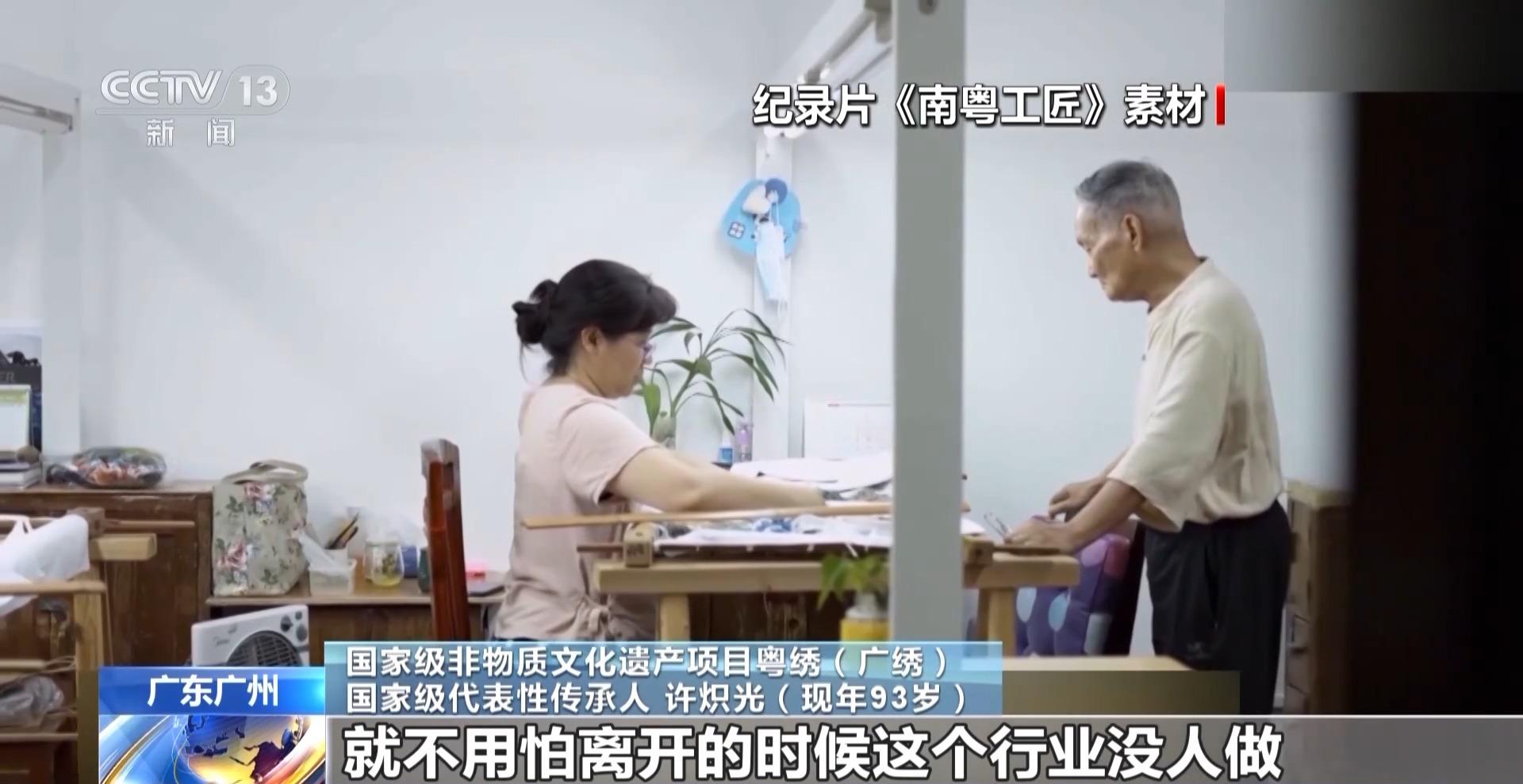 国家级非物质文化遗产项目粤绣(广绣)国家级代表性传承人 许炽光(现年93岁):现在我九十多岁,就不用怕离开的时候这个行业没人做、没人懂得做。