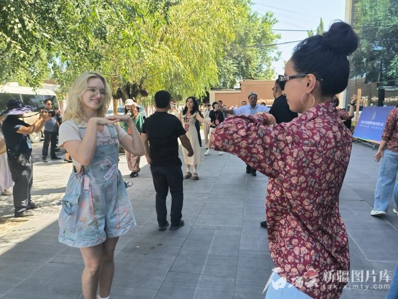 7月24日,梅丽莎(左)在额敏县榆柳巷跟着居民学跳舞。石榴云/新疆日报记者 甘兴华摄