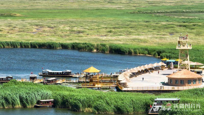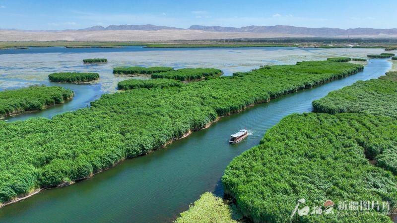 当天,博斯腾湖莲海世界景区内碧波荡漾,万亩睡莲竞相绽放,成片的芦苇随风摇曳,微风过处,绿浪翻涌,鹭鸟翩飞。朵朵绽放的睡莲与碧蓝的湖面、起伏的沙丘、连片的芦苇交相辉映,游客乘船荡漾其间,呈现出一幅“船在湖中行,人在画中游”的生态画卷。
