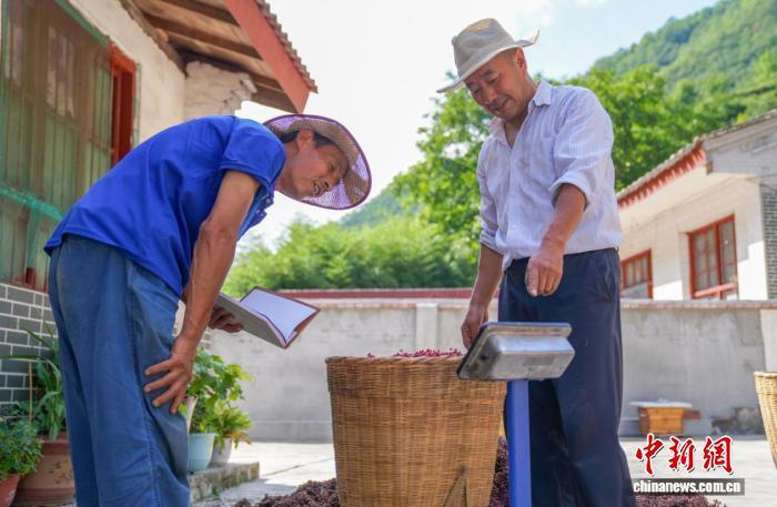 成县王磨镇林口村花椒种植户张翔(左)正在对采摘的鲜花椒进行称重。 陈争强 摄