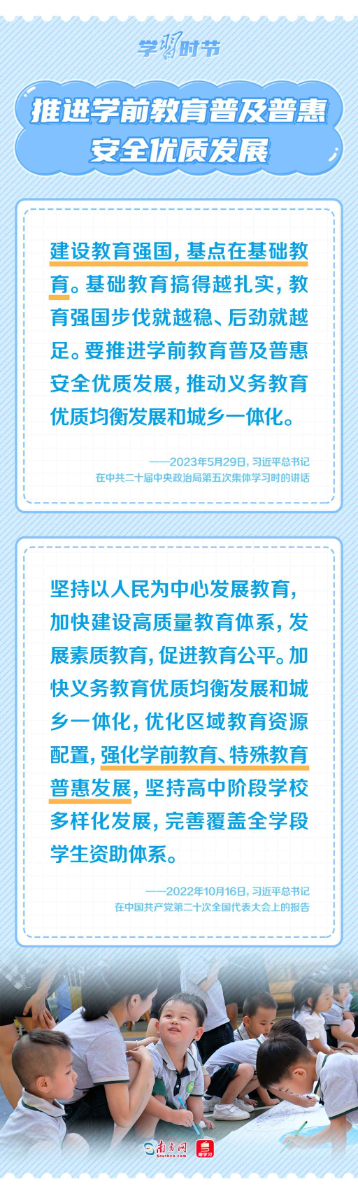 学前教育是我国基础教育体系的重要组成部分,对孩子塑造强健体魄、养成良好习惯起着基础性和先导性作用。习近平总书记多次强调,要加强对基础教育的支持力度,办好学前教育,促进学前教育普惠发展,努力让每个孩子都能享有公平而有质量的教育。今天,我们梳理了总书记的相关重要论述,邀您一同学习领悟。