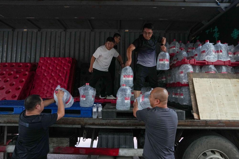 7月27日,在北京市密云区石城镇中心小学安置点,工作人员在卸物资。新华社记者 鞠焕宗 摄