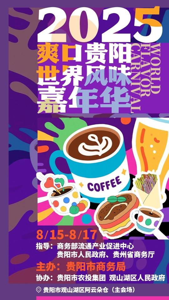 贵阳网·甲秀新闻讯 8月15日至17日,作为商务部2025服务消费季系列活动之一,2025“爽口贵阳・世界风味嘉年华”活动将在贵阳市观山湖区盛大举行。以特色活动为媒,贵阳市将集中展现贵阳精品咖啡、特色餐饮,汇聚国内外全球美食及头部咖啡品牌等多元业态,打造沉浸式消费场景,全力打造“爽爽贵阳・美食天堂”特色品牌。