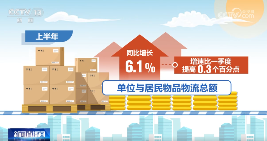 从消费物流来看,上半年,在一系列扩内需、促消费政策带动下,消费市场趋于活跃。上半年单位与居民物品物流总额同比增长6.1%,增速比一季度提高0.3个百分点。