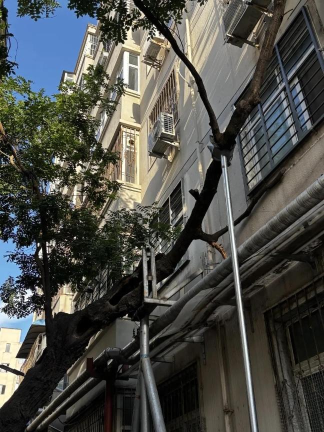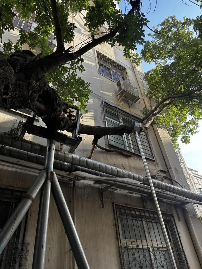 它斜插在不足三米宽的楼间通道,树冠遮蔽了半边道路,槐树的身子,歪斜得厉害,被好几根铁支架牢牢地支着。“早年地面全硬化了,树根被‘捂’得喘不过气。更糟的是,树干内被白蚁掏空,眼看就要不行了。”龚猛说,这棵古树已被园林局列为濒危古树。