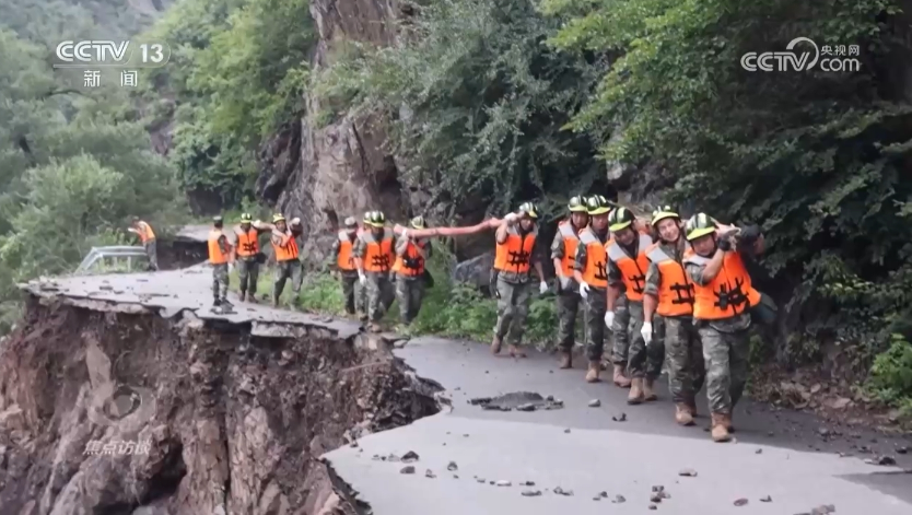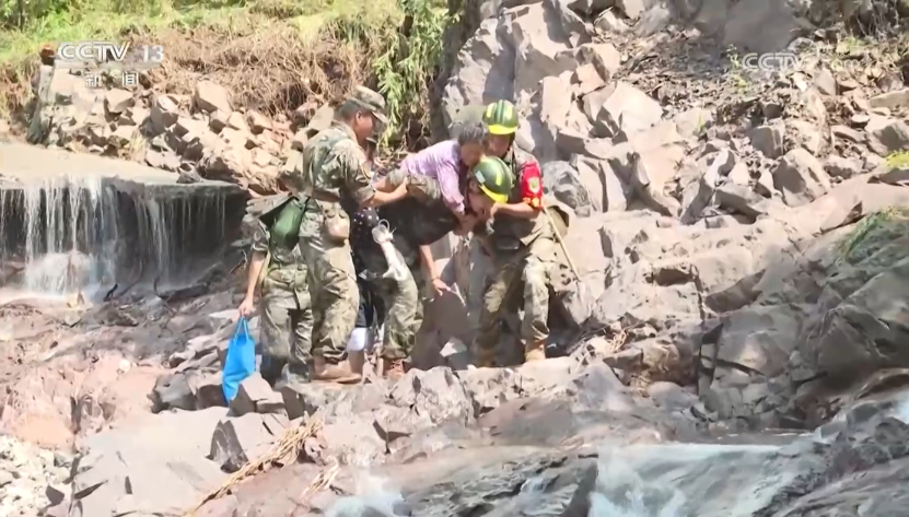 官兵们沿着河道摸索前进,出发不久后就遇到了断崖,他们用绳索索降的方式,成功突破了悬崖障碍。经过两个小时的艰难前行,两组徒步挺进的官兵先后到达失联的桃条沟村。官兵们采取担架转运、交替接力、搀扶前行的方式紧急转运被困人员。