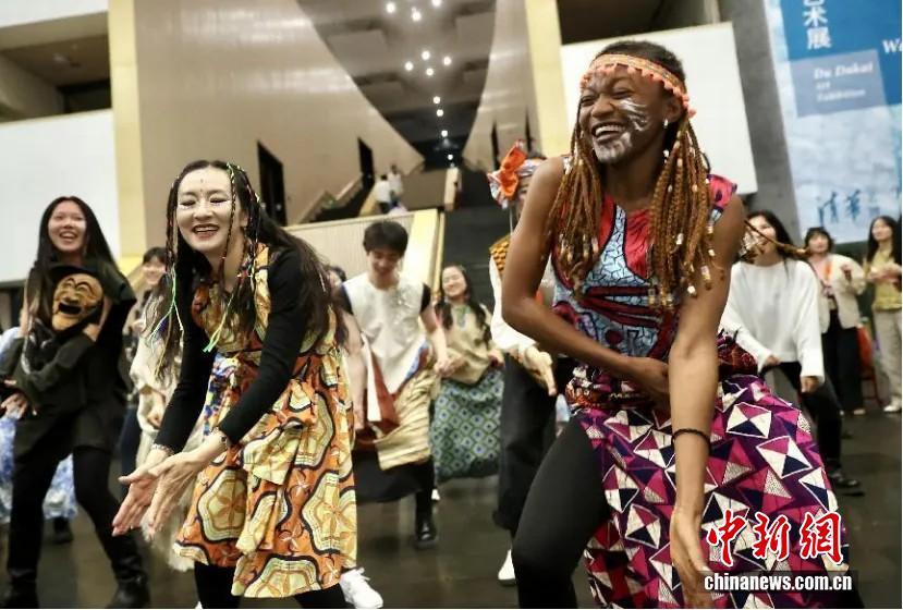 2025年4月27日,清华大学艺术博物馆在北京举办了一场以非洲音乐舞蹈艺术为主题的公共教育活动。图为演员和观众一同跳舞。 中新社记者 易海菲 摄
