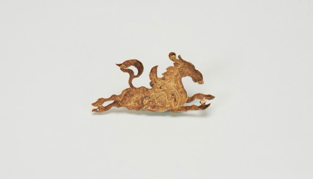 这匹小巧的金马仅长6.4厘米、宽3.2厘米、厚约3毫米,却凝聚着令人惊叹的匠艺与匠心。它被定格于腾空跃起、仰天嘶鸣的瞬间:鬃毛飞扬,肌肉线条遒劲有力。最引人注目的是,工匠为其前肢插上了飞扬的翅膀,尽显凌空翱翔之姿,赋予其超凡的神性。