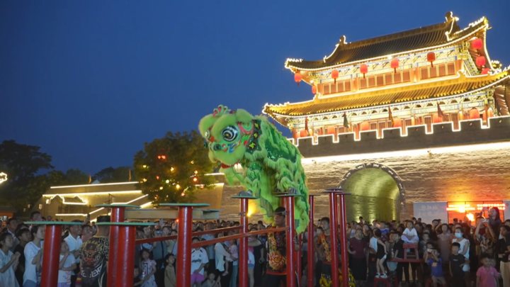 2025年7月,河南省鹤壁市浚县古城,当地文旅部门组织的民俗社火表演成为夜晚的亮点,吸引众多市民和游客前来游玩。新华社视频截图