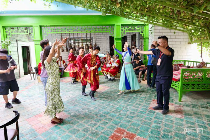 在努尔东·司马义的院落里,艺人与游客即兴共舞 (央广网记者 梁瑜琳 摄)