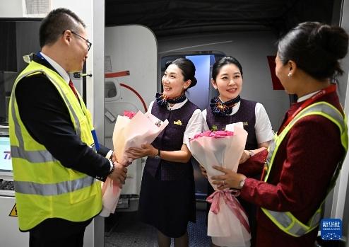 7月30日晚,在哈萨克斯坦阿拉木图国际机场,工作人员向国航北京至阿拉木图首航航班机组成员献花。新华社记者李任滋摄
