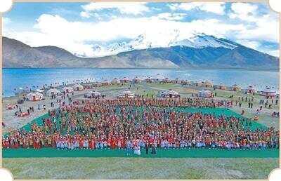 在克州慕士塔格峰下的喀拉库勒湖畔,民众在玛纳斯国际文化旅游节上齐唱玛纳斯。克孜勒苏柯尔克孜自治州委宣传部供图
