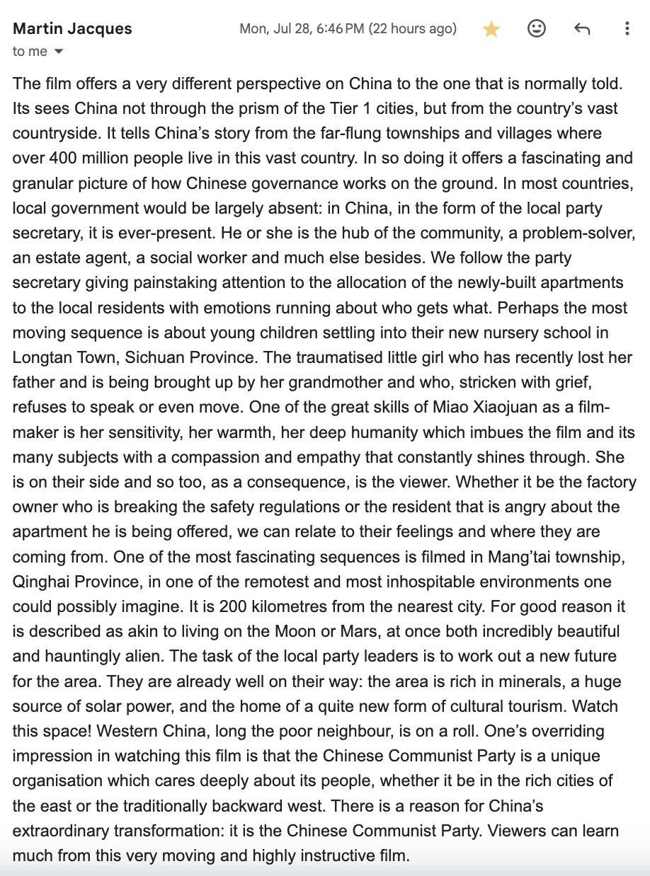 他还指出:“在中国,基层党组织书记无处不在。他们身兼数职,是社区的主心骨,是协调矛盾的能手,是拆迁分房的‘经纪人’,也是百姓身边的社工。看完此片我最深刻的感受是,中国共产党是一种极为独特的组织,它真切关心人民,无论是在东部富庶的城市,还是在西部曾经落后的乡野。中国之所以能实现如此非凡的历史性转变,根本原因就在于中国共产党。”