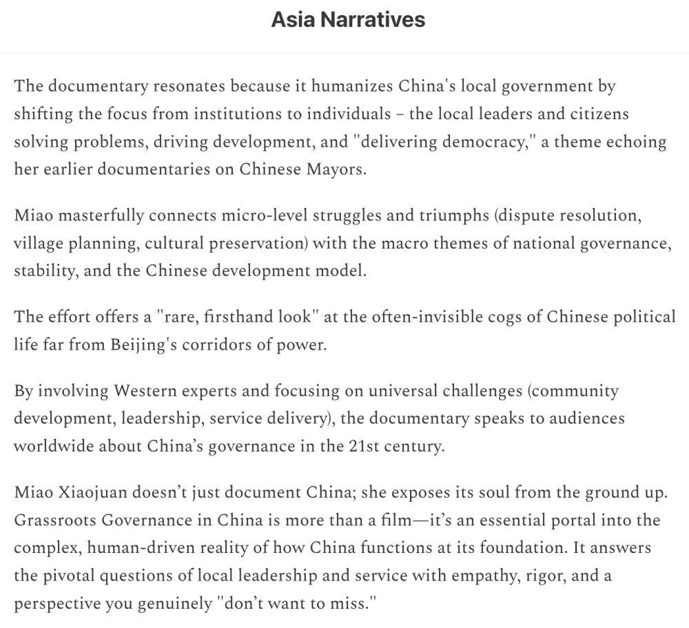 作为参与此片拍摄的专家之一,美国政经时事评论员、太和智库高级研究员艾纳·唐恩在《亚洲叙事》新闻信上撰文力荐《县乡治》,引发业界学界热议。