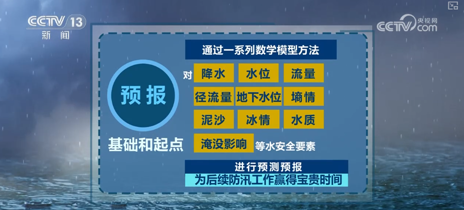 预报是基础和起点,通过一系列数学模型方法,对降水、水位、流量、径流量、地下水位、墒情、泥沙、冰情、水质、淹没影响等水安全要素进行预测预报,为后续防汛工作赢得宝贵时间。