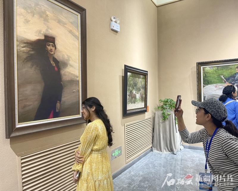 优雅妩媚的俄罗斯族少女,青色草原深处的牧人之家,驾着驴车赶巴扎的幸福一家……油画展厅里,这些浪漫诗意的画面定格在一幅幅油画中,留学生们驻足观赏、不时交流,在喜欢的作品前打卡拍照。