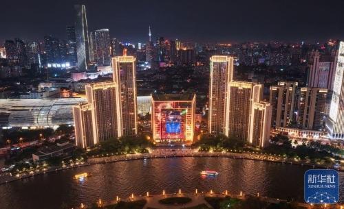 ↑这是8月1日在天津站后广场拍摄的海河沿岸楼体灯光(无人机照片)。