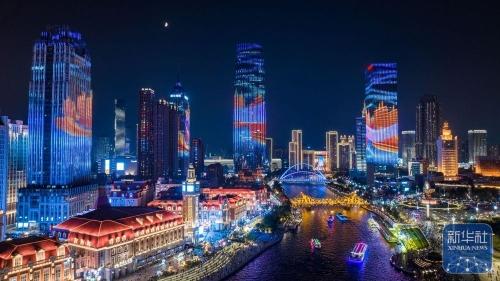 华灯初上,海河两岸的夜景灯光渐次点亮。现代高楼流光溢彩,海河游船穿梭不息,桥梁灯带映射水面形成五彩斑斓的倒影,共同绘就津城靓丽的夜色风景线。