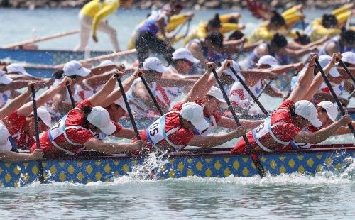 ↑2023年10月4日,中国队选手(前)在杭州亚运会龙舟项目女子组12人龙舟200米直道竞速赛决赛中。