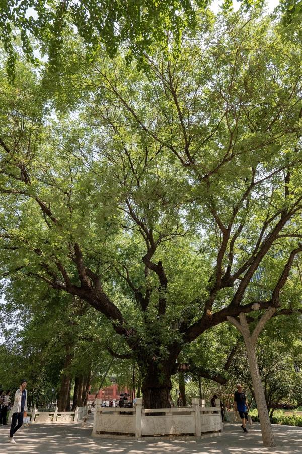 我们走近了看,树干粗粝得惊人,深褐色的树皮皴裂开深深的沟壑,无声地诉说着漫长的岁月。树下围着一圈洁白的汉白玉栏杆,更衬得它古朴庄重。